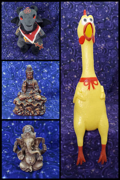 Left, Top: a plushy Baphomet wearing a Knight Templar cross (representing Balance);
